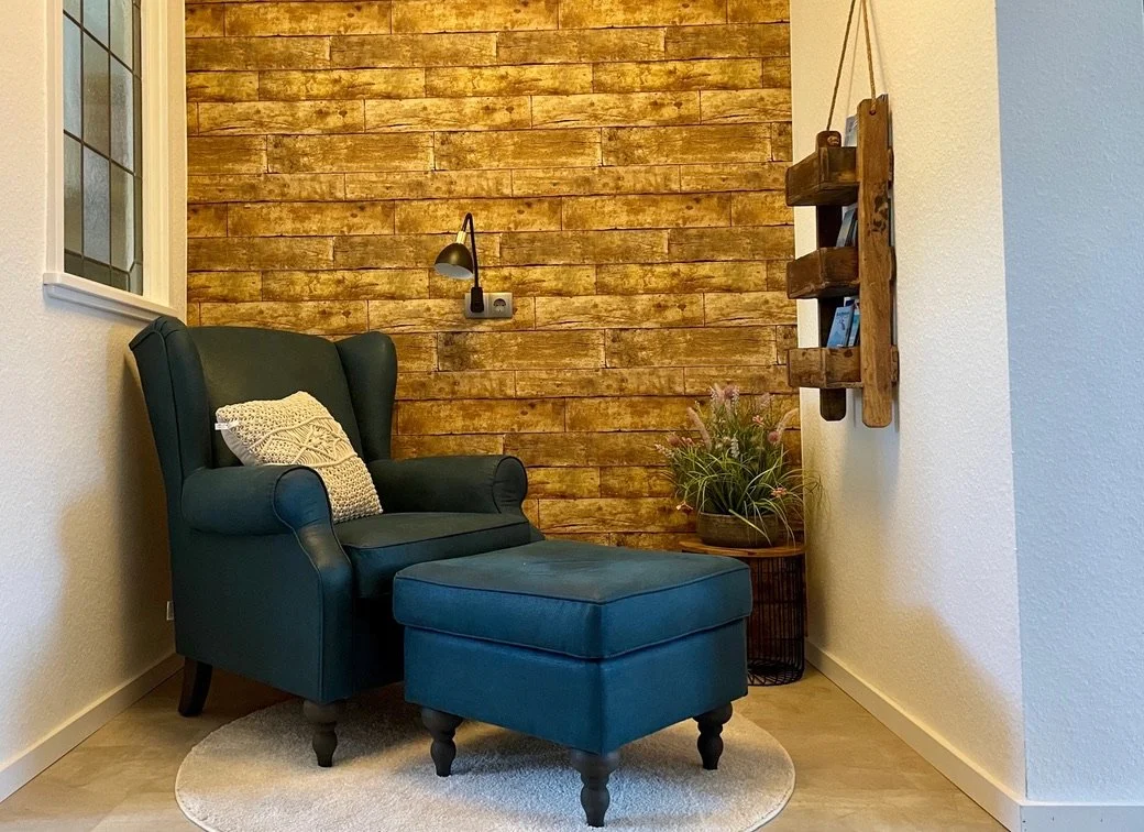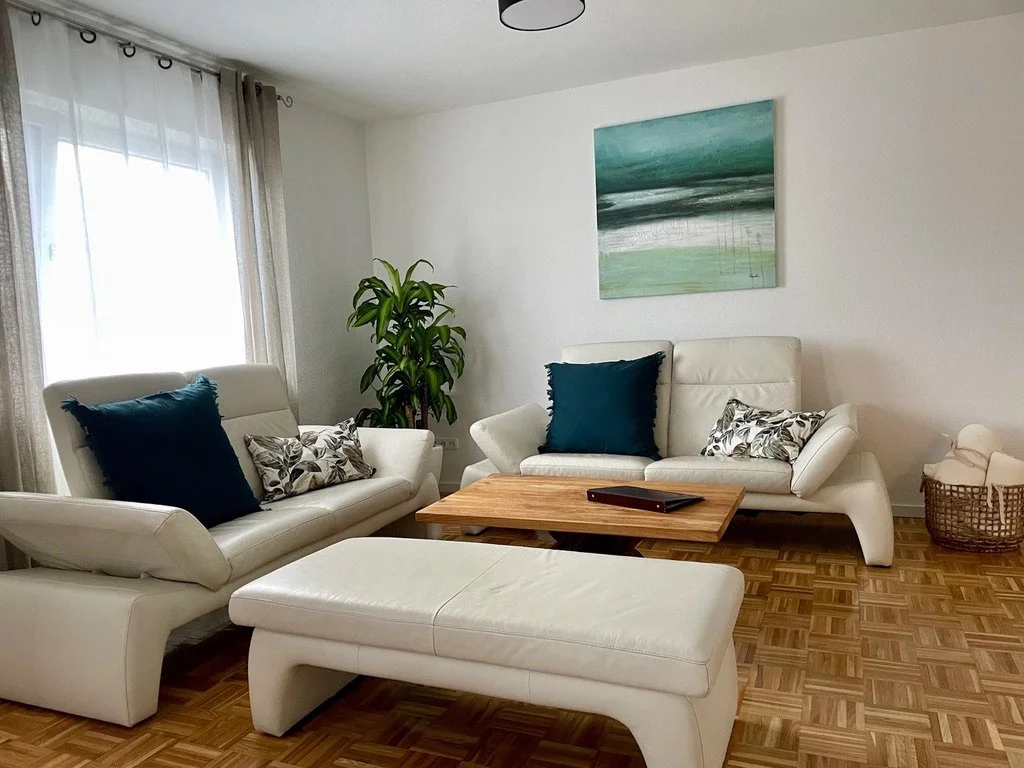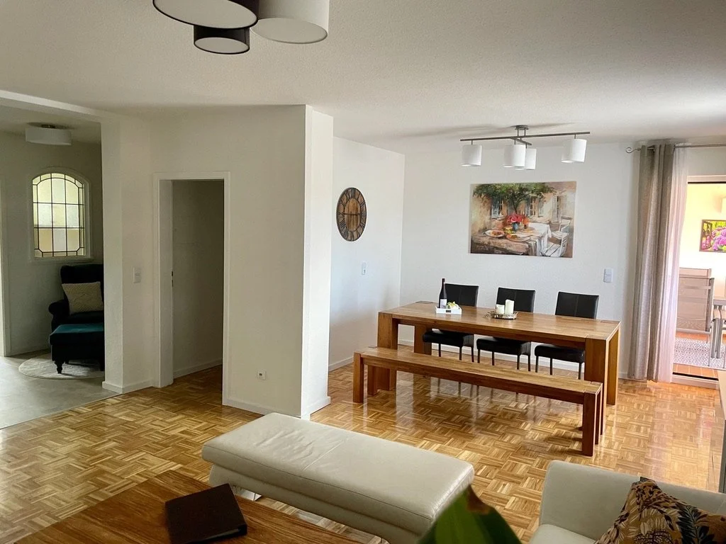 Das modern und rustikal eingerichtete Wohnzimmer, mit großem Smart TV, gemütlichem Sofás und heller Essecke lädt zum Wohlfühlen ein.